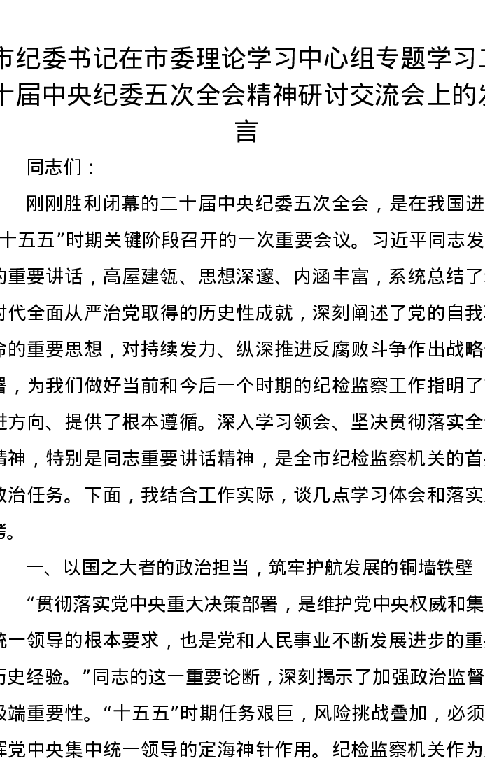 市纪委书记在市委理论学习中心组专题学习二十届中央纪委五次全会精神研讨交流会上的发言