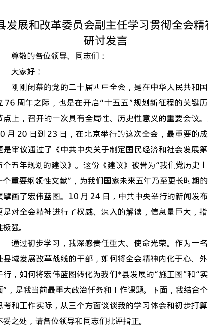 县发展和改革委员会副主任学习贯彻全会精神研讨发言