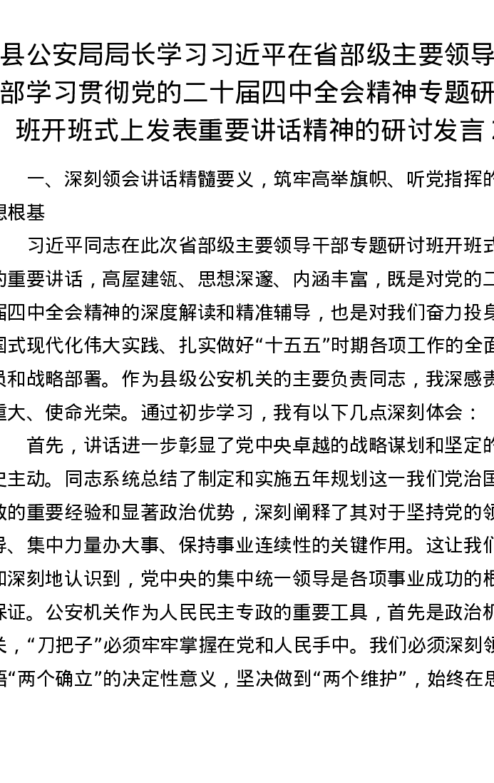 县公安局局长学习总书记在省部级主要领导干部学习贯彻党的二十届四中全会精神专题研讨班开班式上发表重要讲话精神的研讨发言2