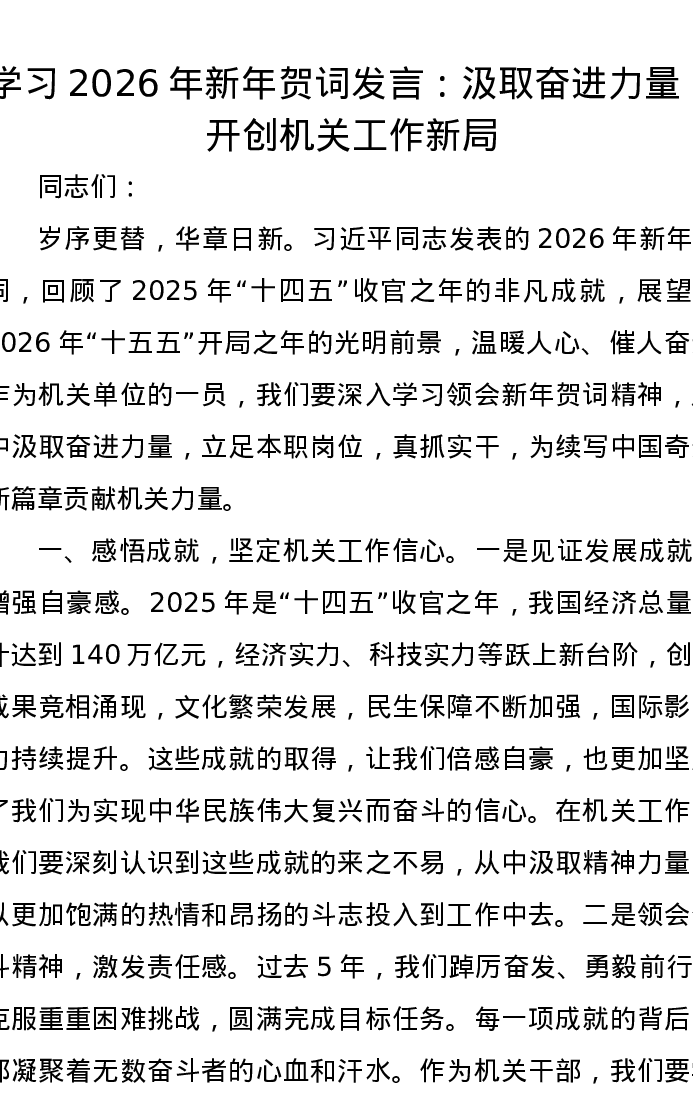 学习2026年新年贺词发言:汲取奋进力量,开创机关工作新局
