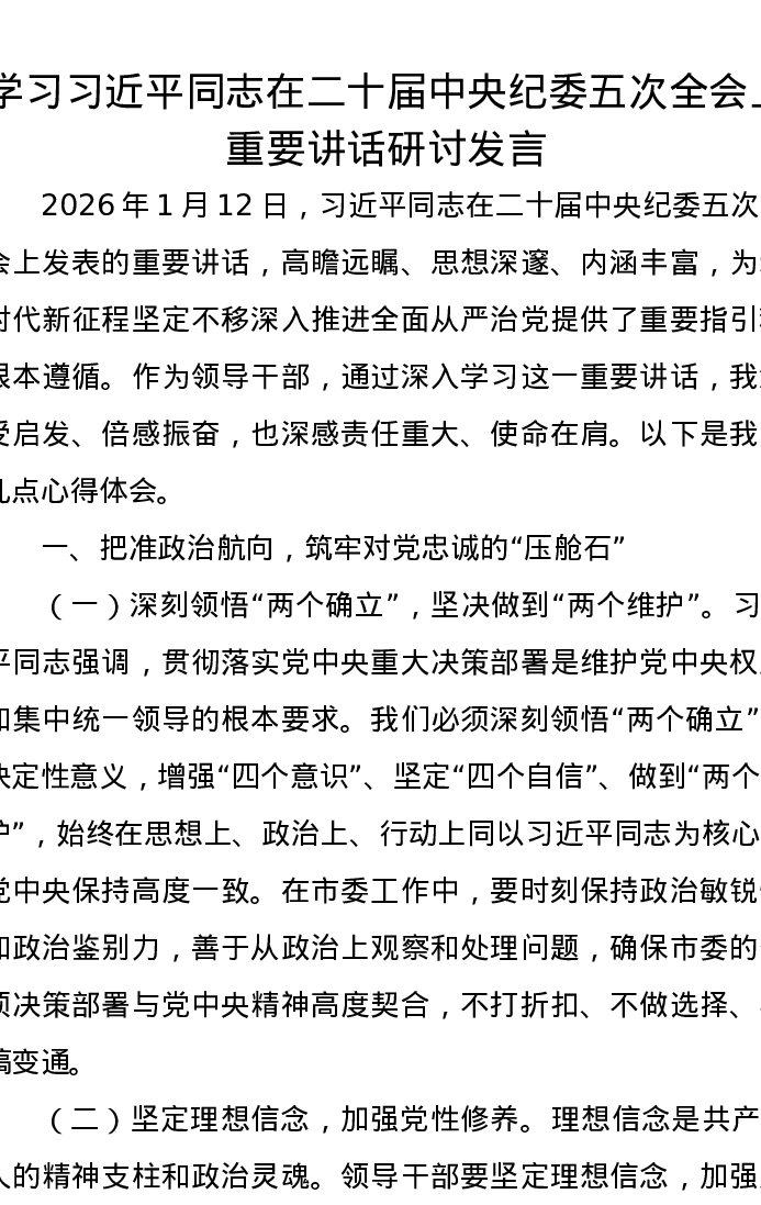 学习习近平总书记在二十届中央纪委五次全会上重要讲话研讨发言