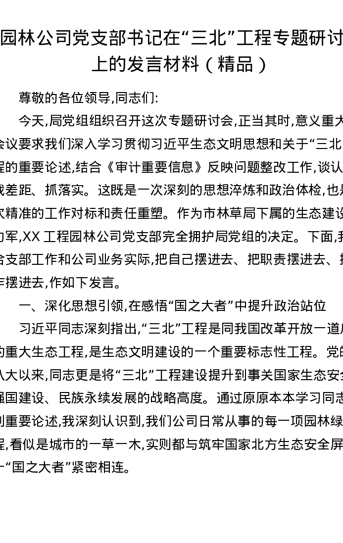 园林公司党支部书记在三北工程专题研讨会上的发言材料