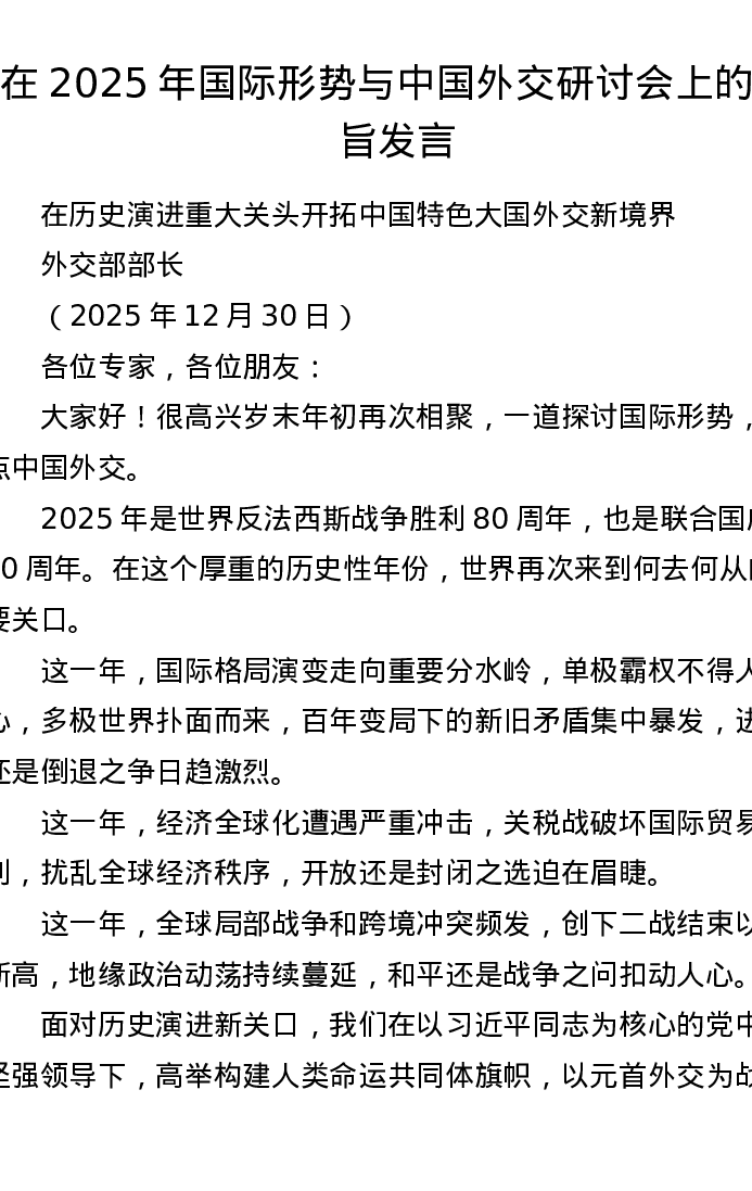在2025年国际形势与中国外交研讨会上的主旨发言