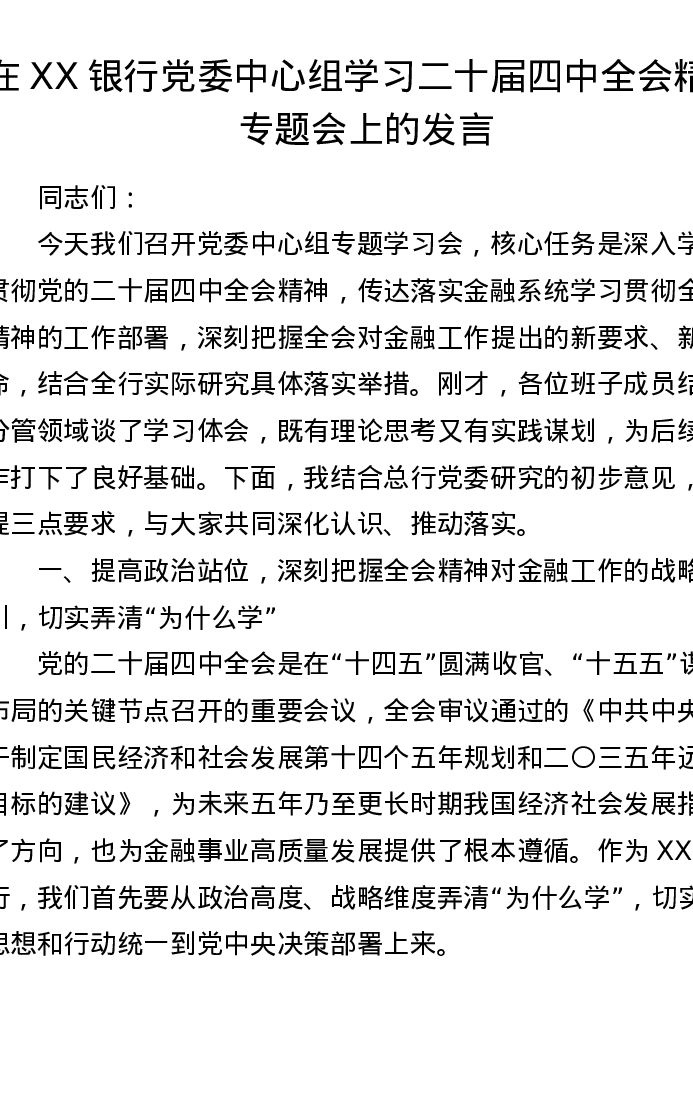 在XX银行党委中心组学习二十届四中全会精神专题会上的发言