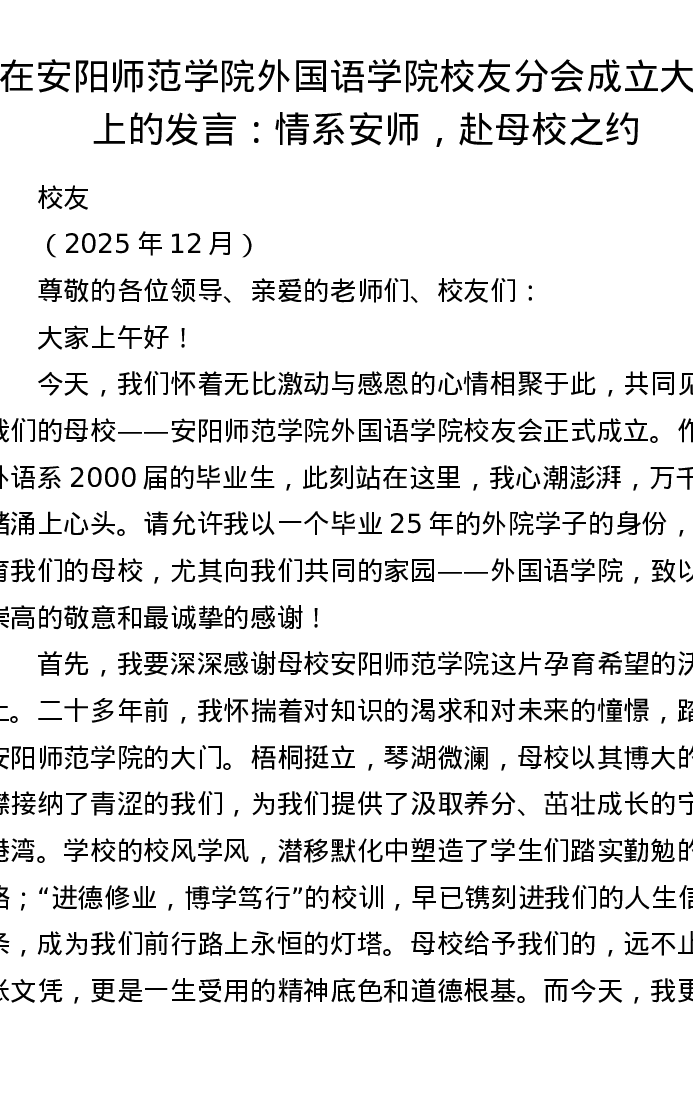 在安阳师范学院外国语学院校友分会成立大会上的发言:情系安师,赴母校之约