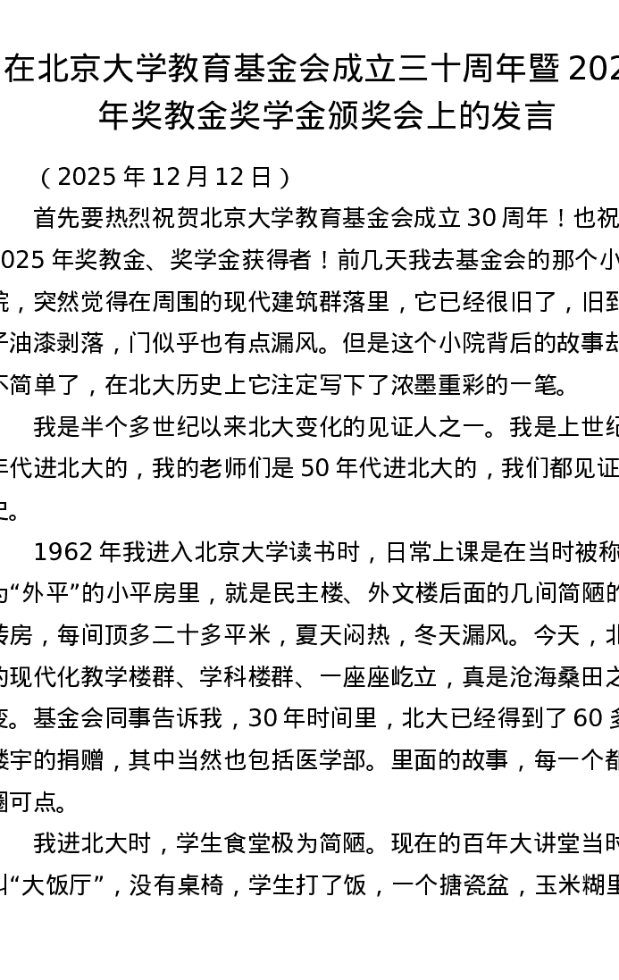 在北京大学教育基金会成立三十周年暨2025年奖教金奖学金颁奖会上的发言