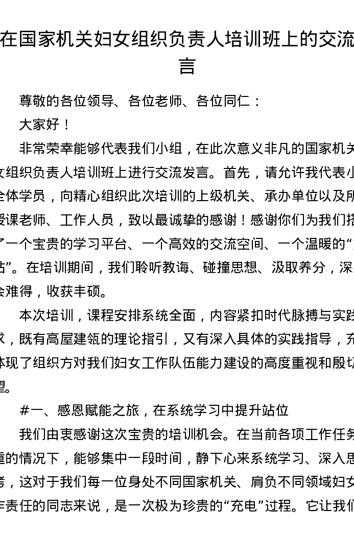 在国家机关妇女组织负责人培训班上的交流发言(2863字)