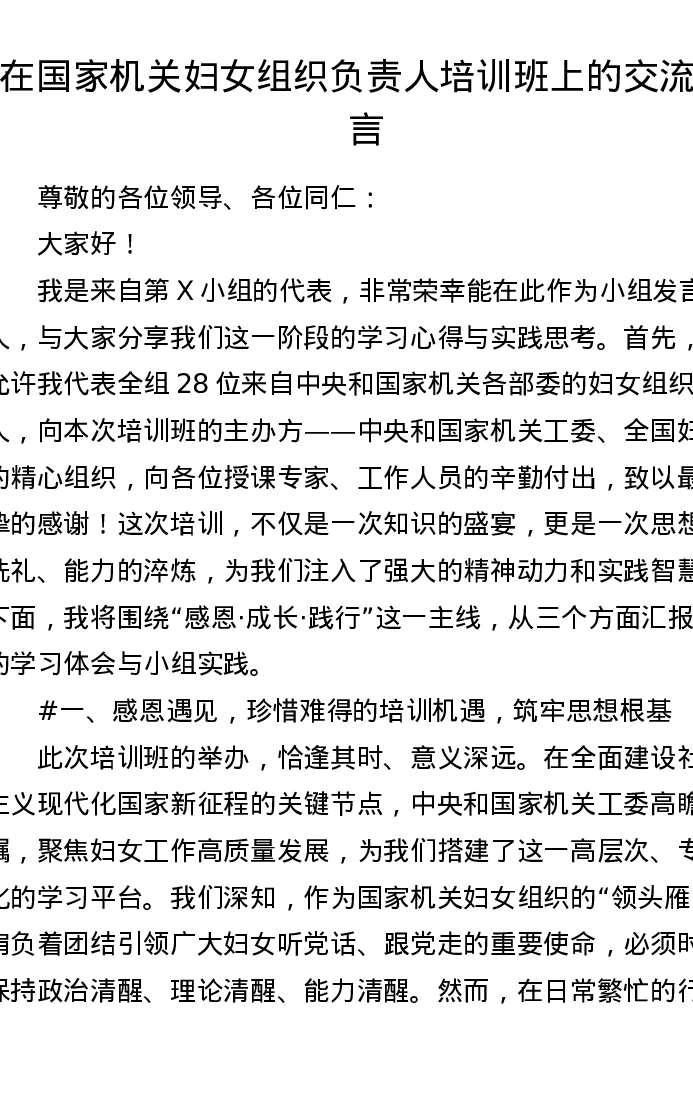在国家机关妇女组织负责人培训班上的交流发言(3865字)
