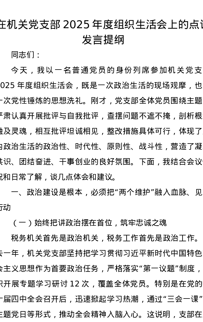 在机关党支部2025年度组织xxx上的点评发言提纲