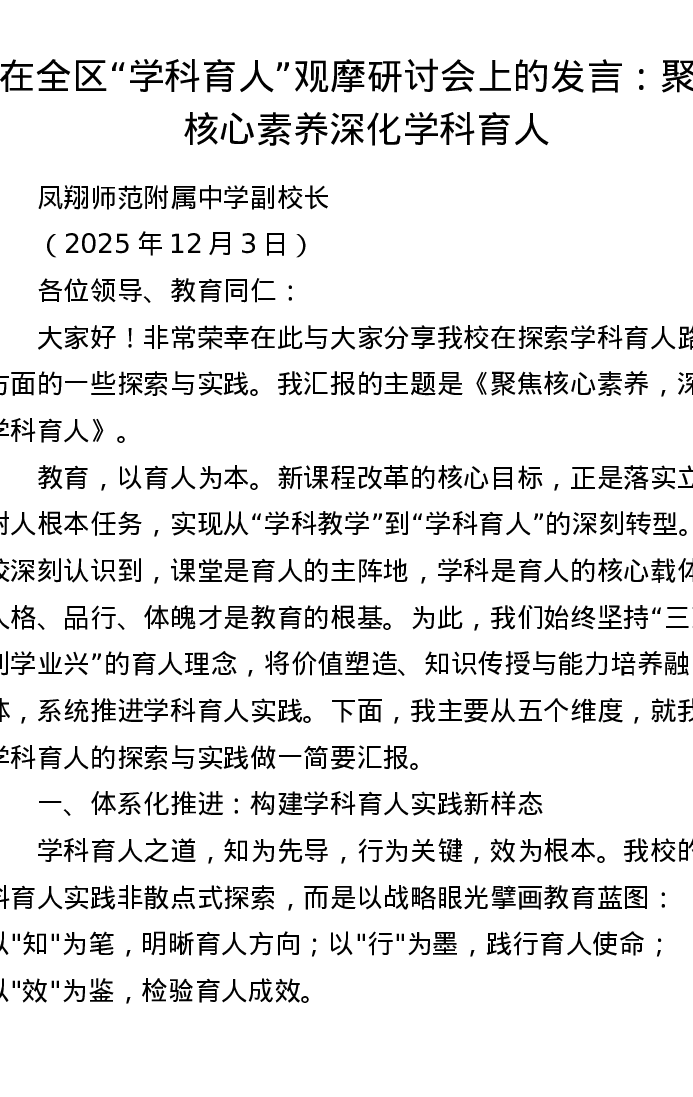 在全区学科育人观摩研讨会上的发言:聚焦核心素养深化学科育人