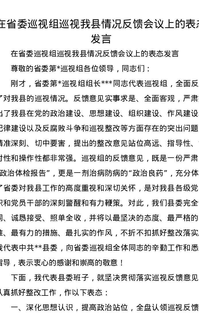在省委巡视组巡视我县情况反馈会议上的表态发言