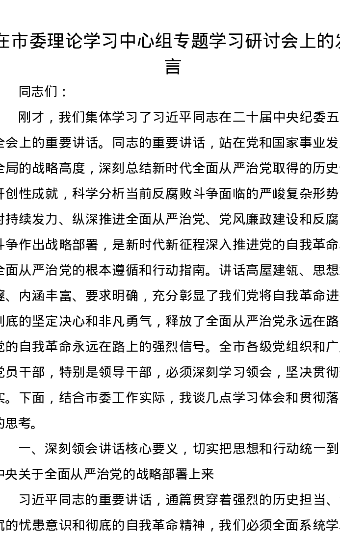 在市委理论学习中心组专题学习研讨会上的发言