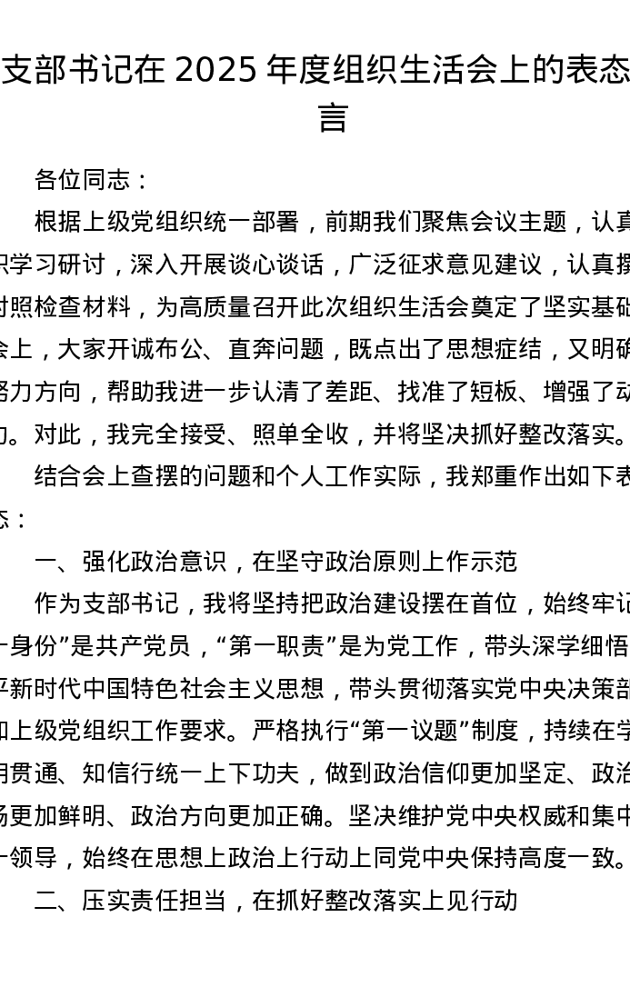 支部书记在2025年度组织xxx上的表态发言