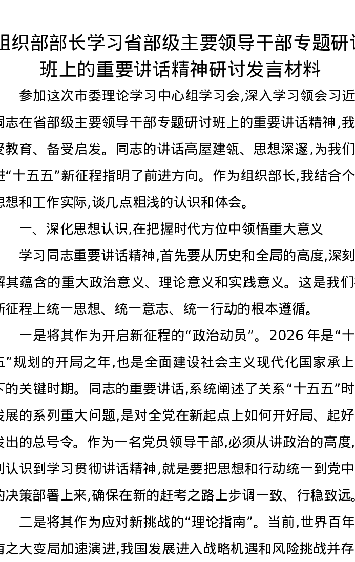 组织部部长学习省部级主要领导干部专题研讨班上的重要讲话精神研讨发言材料