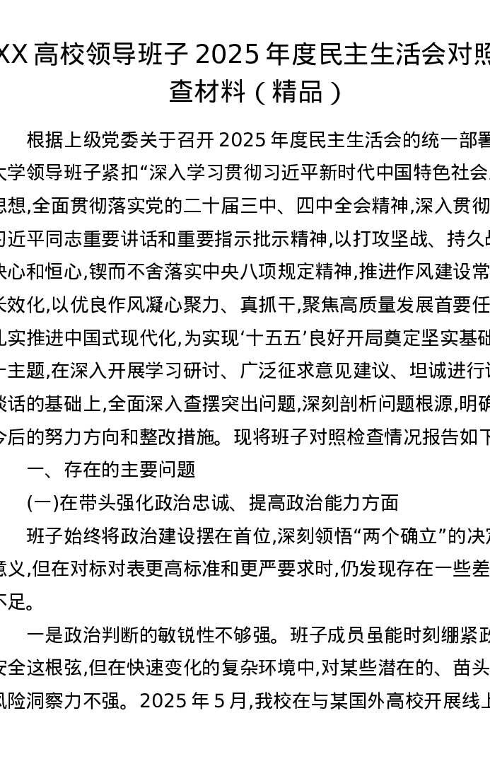 XX高校领导班子2025年度xxxxx对照检查材料