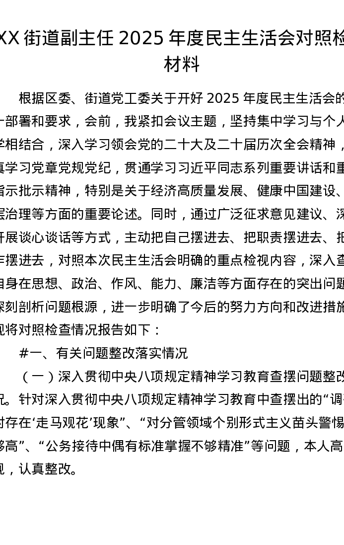 XX街道副主任2025年度xxxxx对照检查材料(7293字)