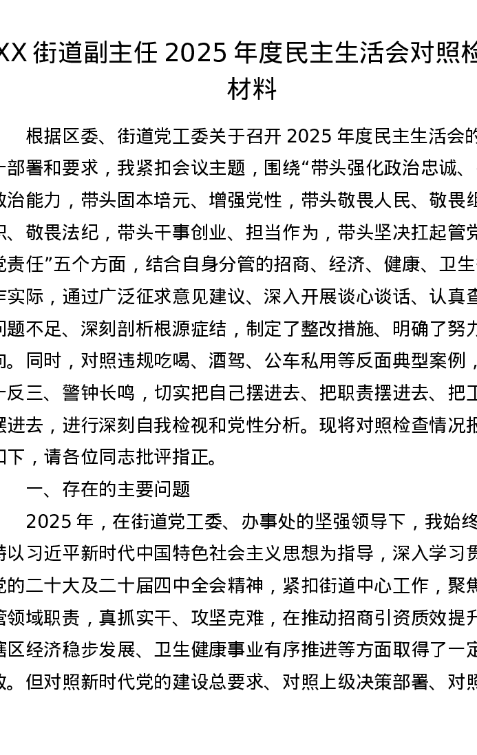 XX街道副主任2025年度xxxxx对照检查材料