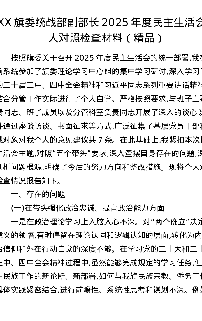 XX旗委统战部副部长2025年度xxxxx个人对照检查材料