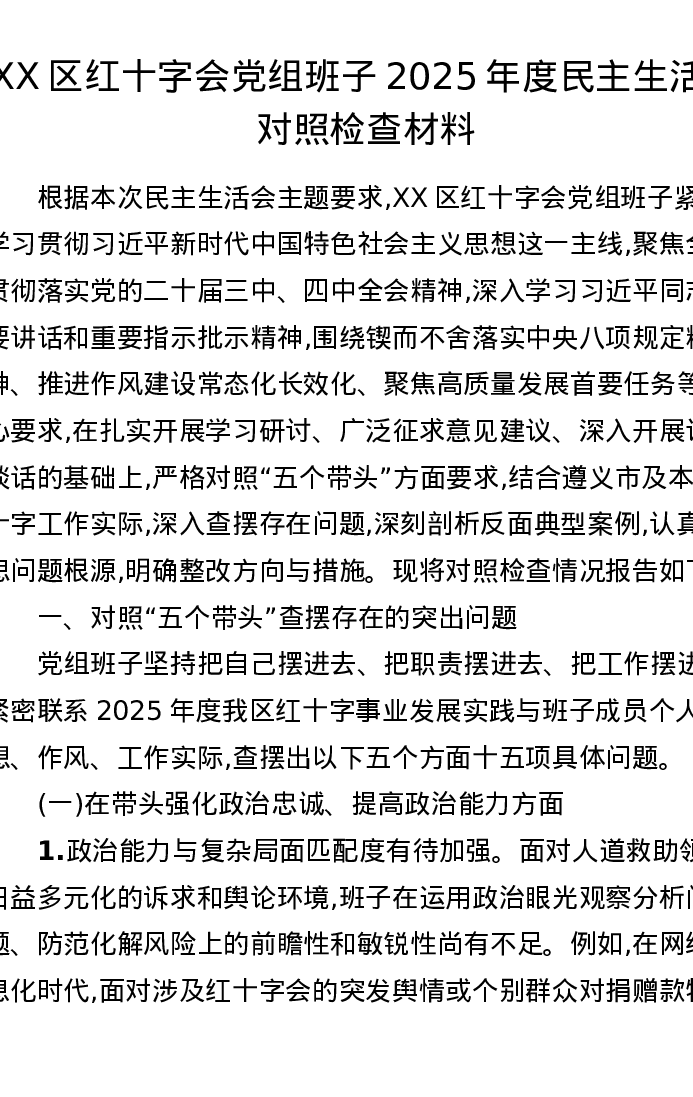 XX区红十字会党组班子2025年度xxxxx对照检查材料