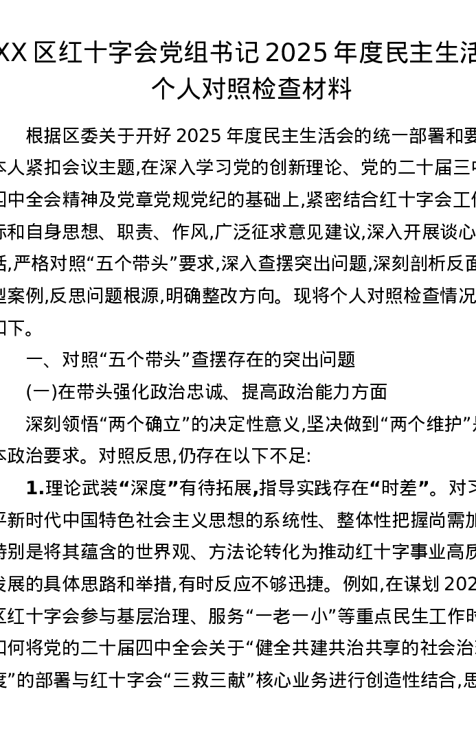 XX区红十字会党组书记2025年度xxxxx个人对照检查材料