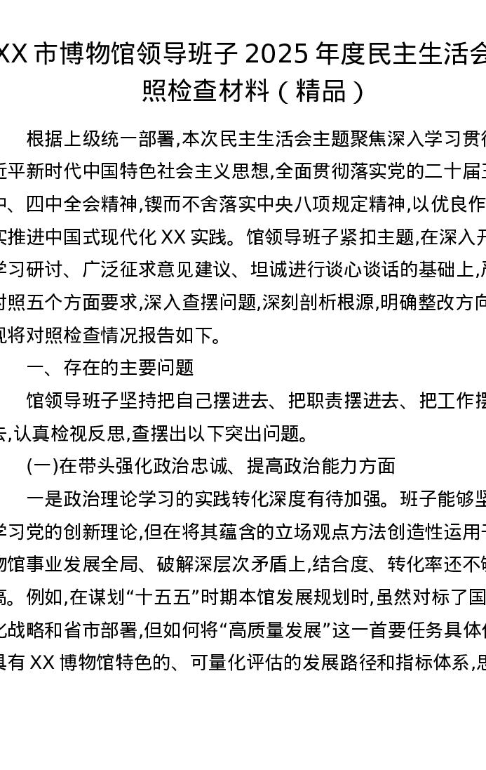 XX市博物馆领导班子2025年度xxxxx对照检查材料