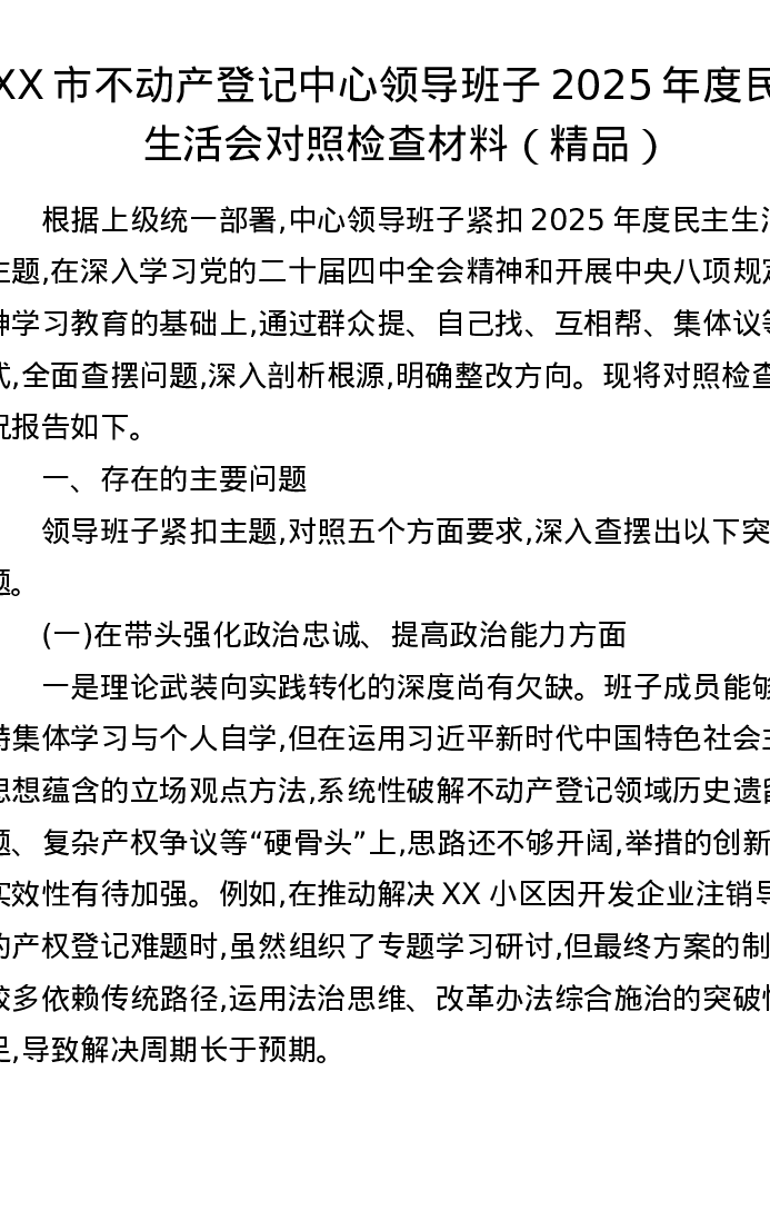 XX市不动产登记中心领导班子2025年度xxxxx对照检查材料
