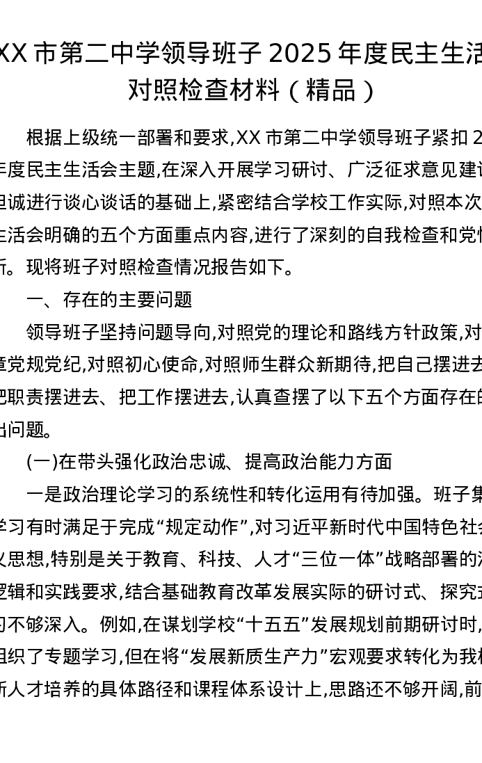 XX市第二中学领导班子2025年度xxxxx对照检查材料