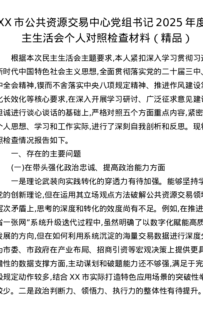 XX市公共资源交易中心党组书记2025年度xxxxx个人对照检查材料