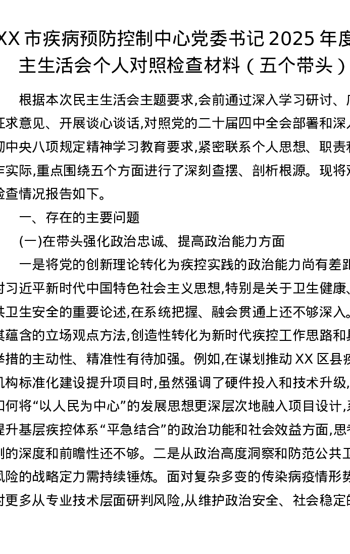 XX市疾病预防控制中心党委书记2025年度xxxxx个人对照检查材料(五个带头)