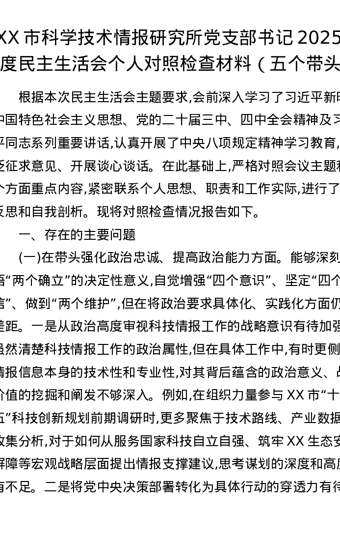 XX市科学技术情报研究所党支部书记2025年度xxxxx个人对照检查材料(五个带头)