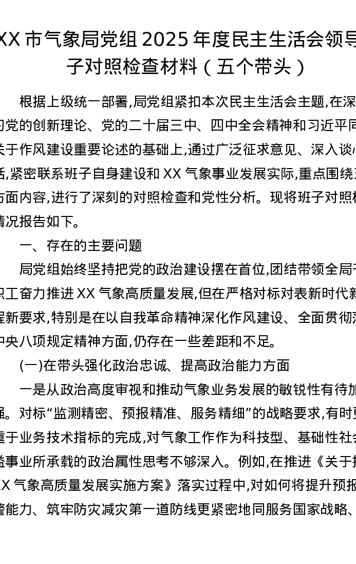 XX市气象局党组2025年度xxxxx领导班子对照检查材料(五个带头)