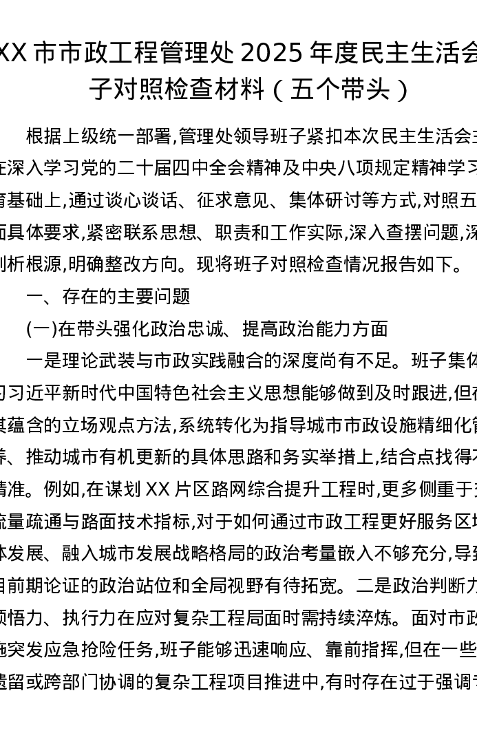 XX市市政工程管理处2025年度xxxxx班子对照检查材料(五个带头)