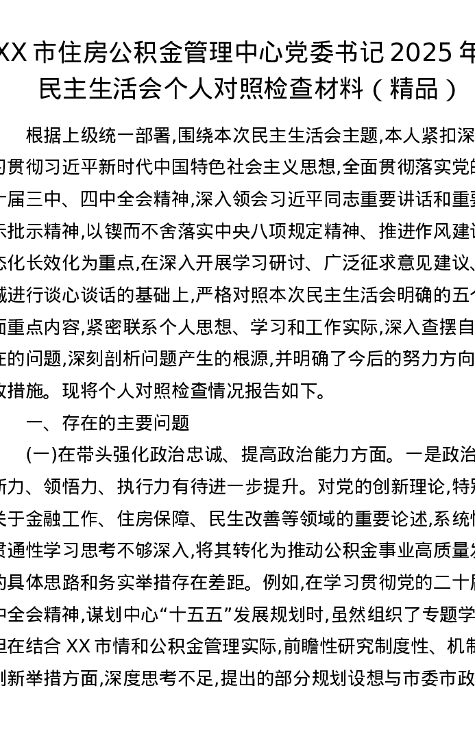 XX市住房公积金管理中心党委书记2025年度xxxxx个人对照检查材料