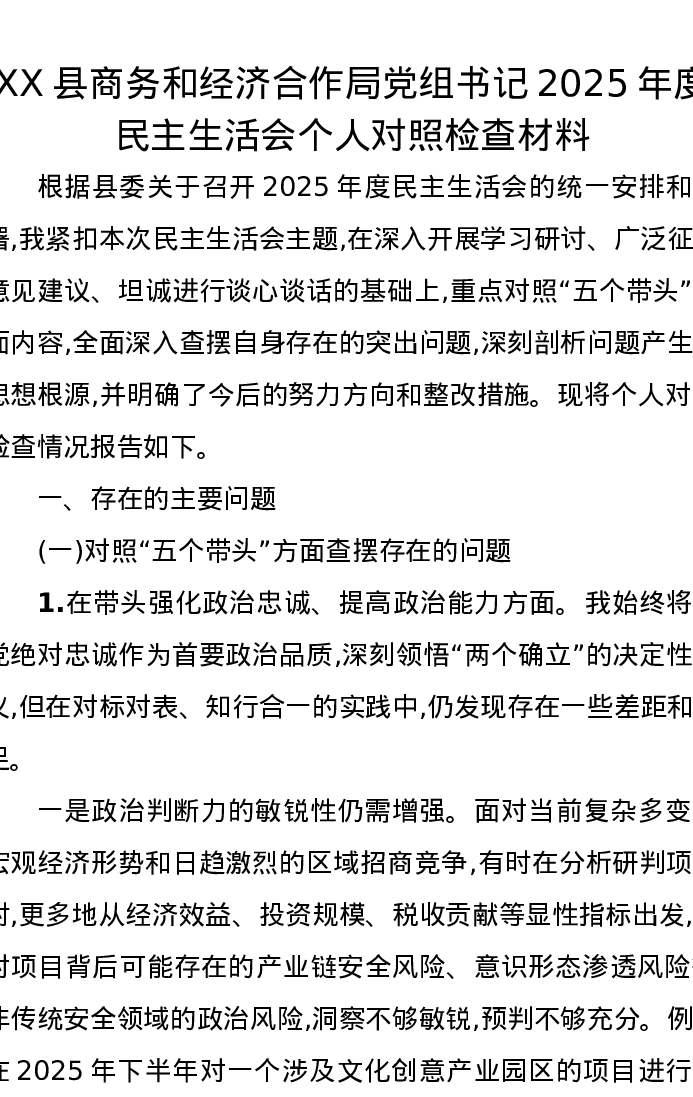 XX县商务和经济合作局党组书记2025年度xxxxx个人对照检查材料
