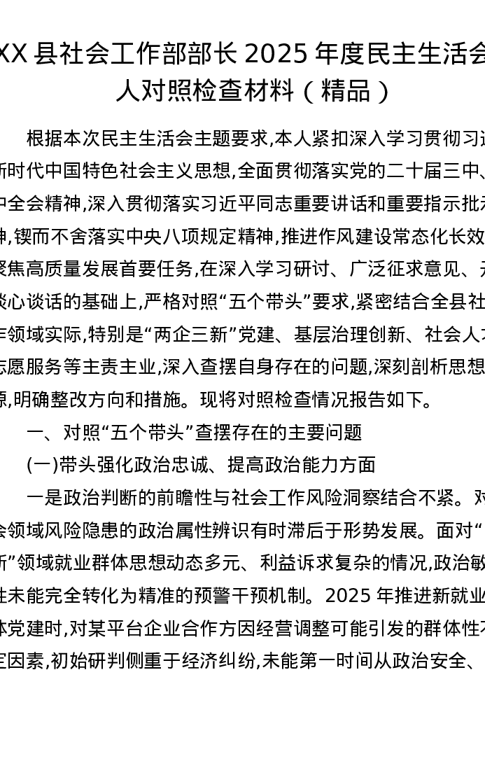 XX县社会工作部部长2025年度xxxxx个人对照检查材料