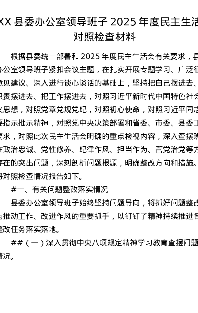 XX县委办公室领导班子2025年度xxxxx对照检查材料(6483字)