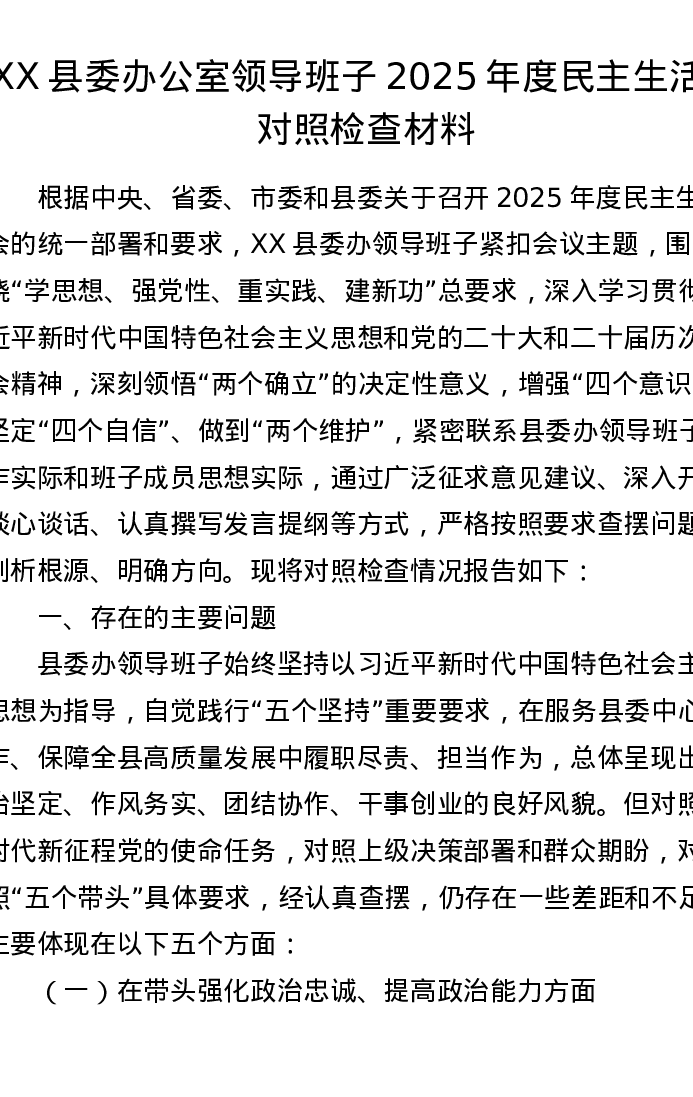 XX县委办公室领导班子2025年度xxxxx对照检查材料