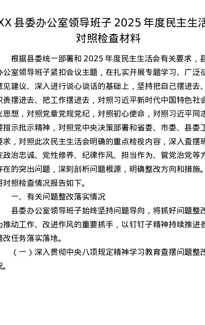 XX县委办公室领导班子2025年度xxxxx对照检查材料2