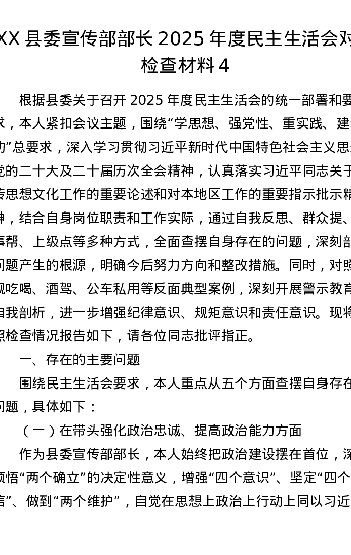 XX县委宣传部部长2025年度xxxxx对照检查材料4