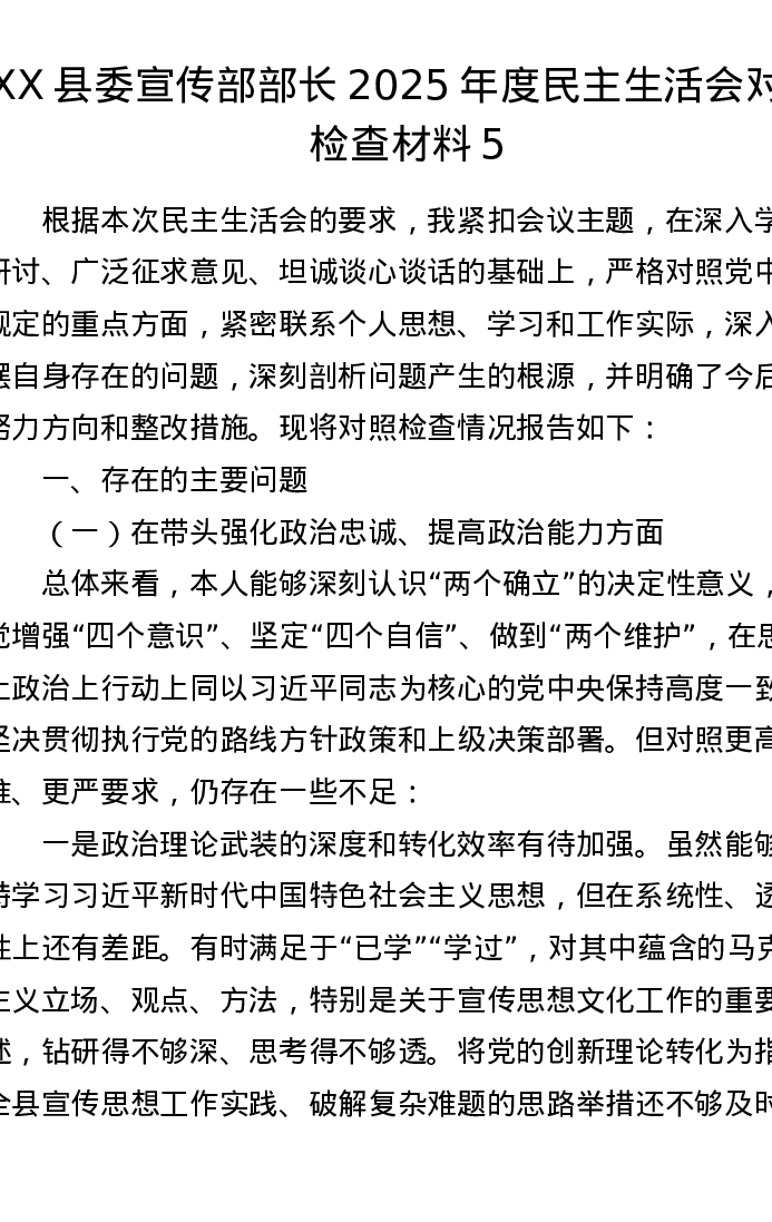 XX县委宣传部部长2025年度xxxxx对照检查材料5