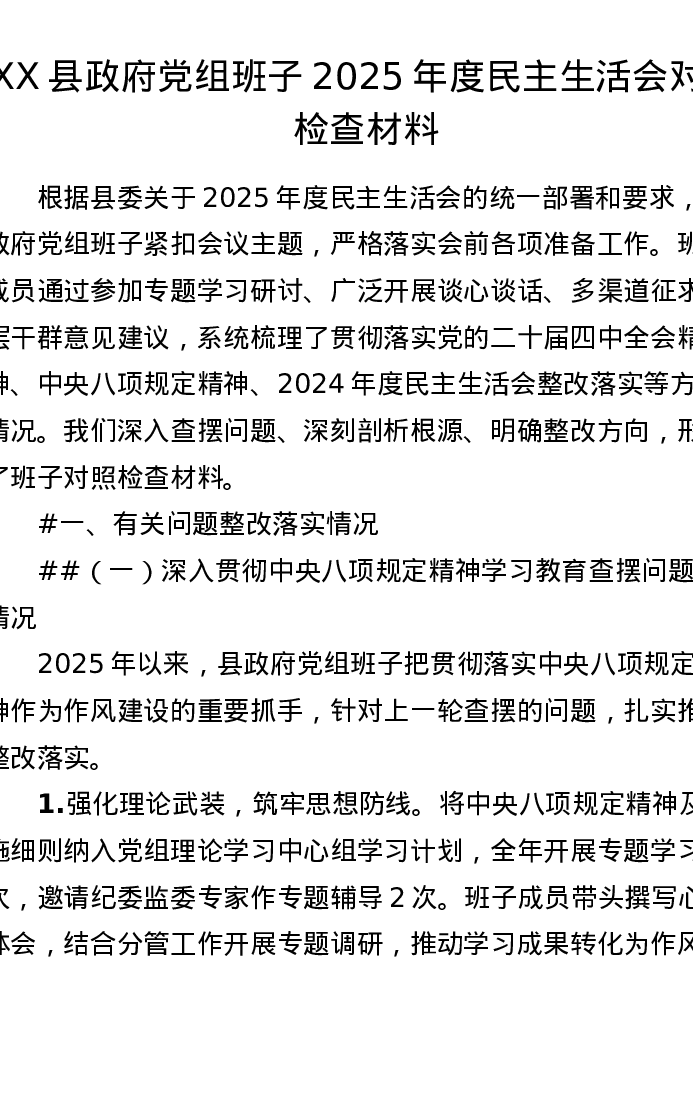 XX县政府党组班子2025年度xxxxx对照检查材料(6449字)