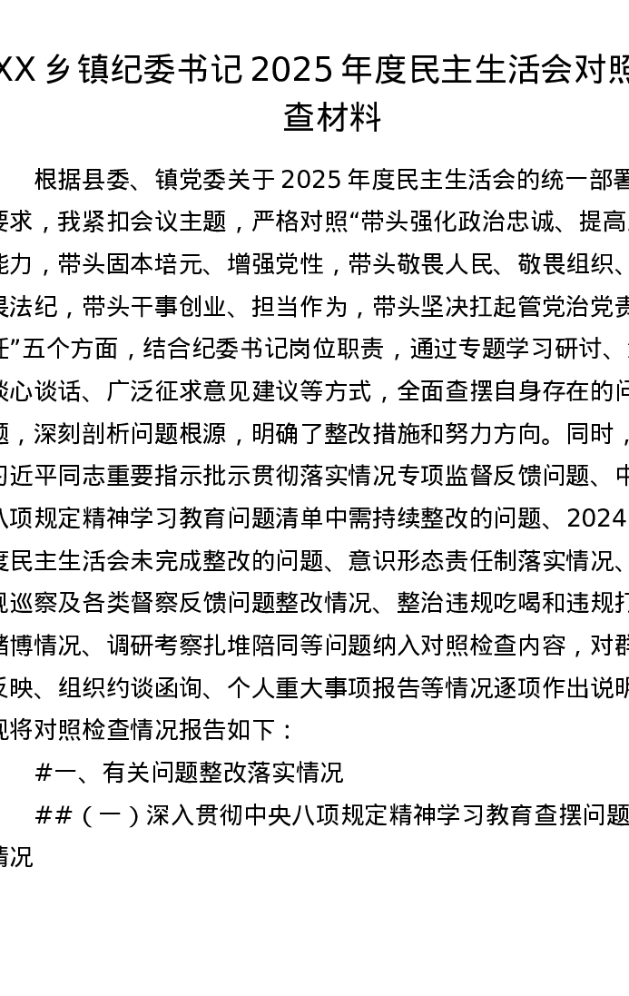 XX乡镇纪委书记2025年度xxxxx对照检查材料(7099字)