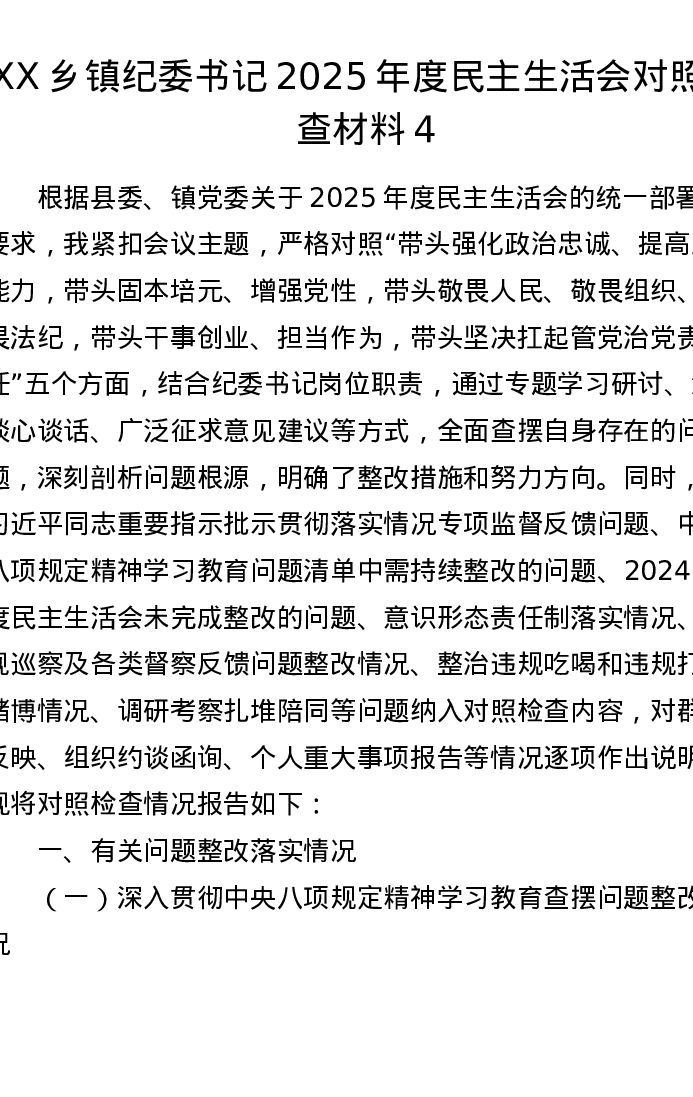 XX乡镇纪委书记2025年度xxxxx对照检查材料4