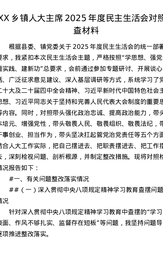 XX乡镇人大主席2025年度xxxxx对照检查材料(6672字)