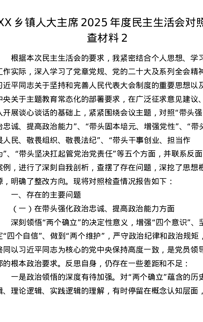 XX乡镇人大主席2025年度xxxxx对照检查材料2