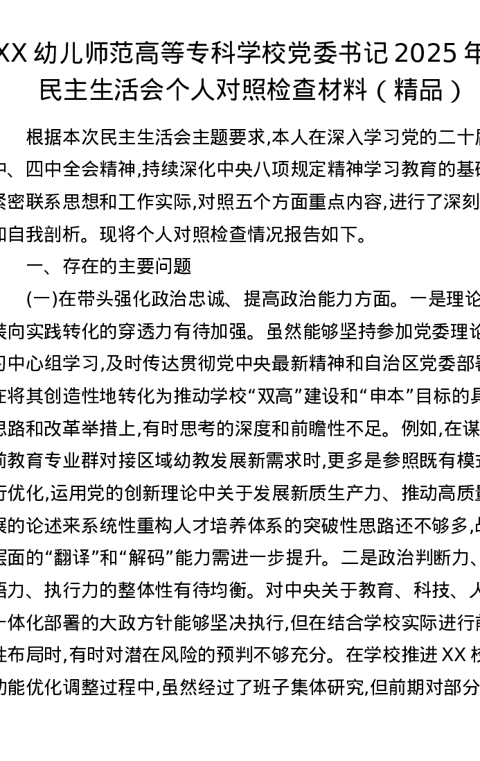 XX幼儿师范高等专科学校党委书记2025年度xxxxx个人对照检查材料