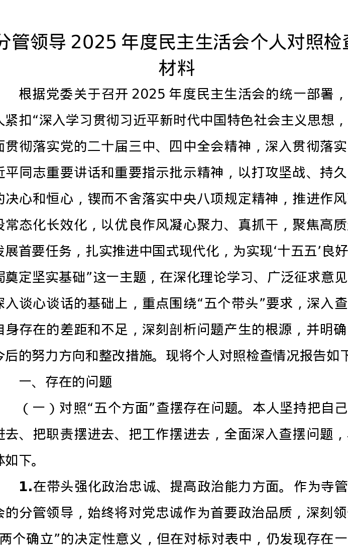 分管领导2025年度xxxxx个人对照检查材料