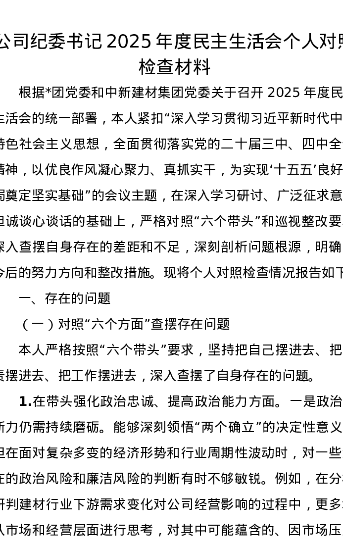 公司纪委书记2025年度xxxxx个人对照检查材料