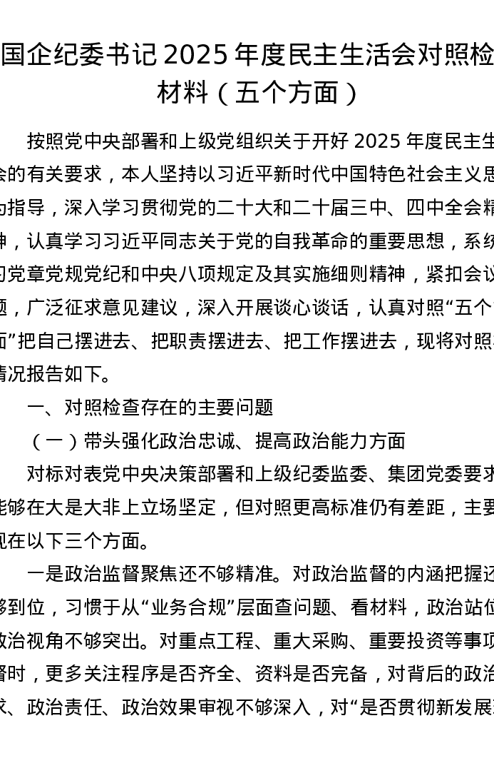 国企纪委书记2025年度xxxxx对照检查材料(五个方面)