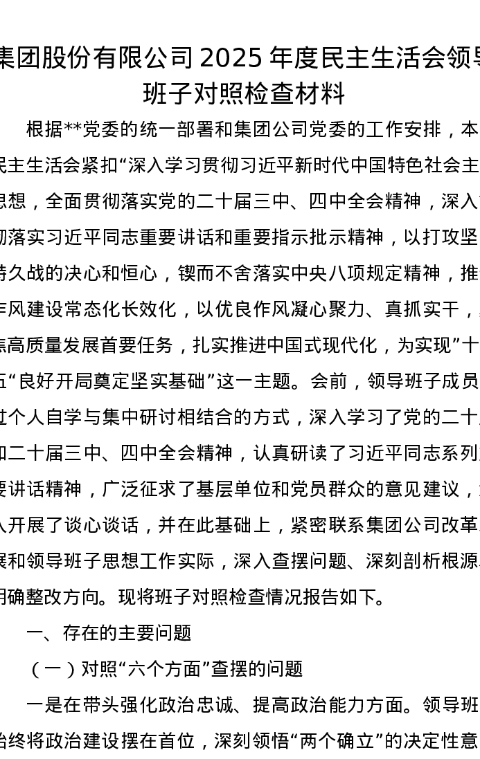 集团股份有限公司2025年度xxxxx领导班子对照检查材料